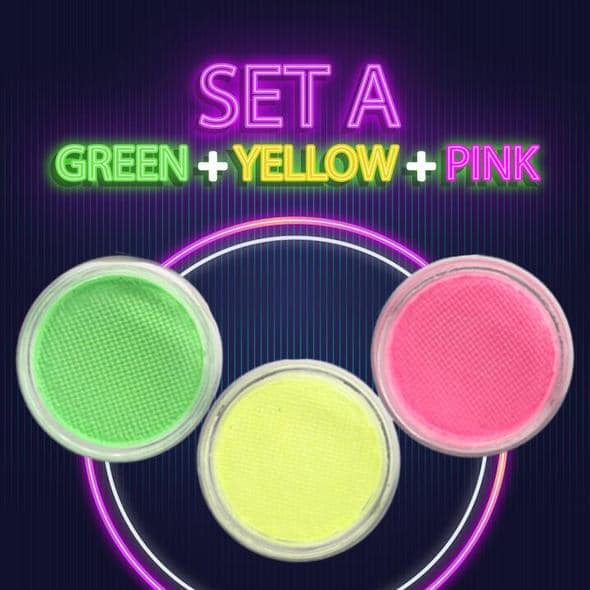 - Set A (geel + roze + groen); Set B (Blauw + Paars + Groen)